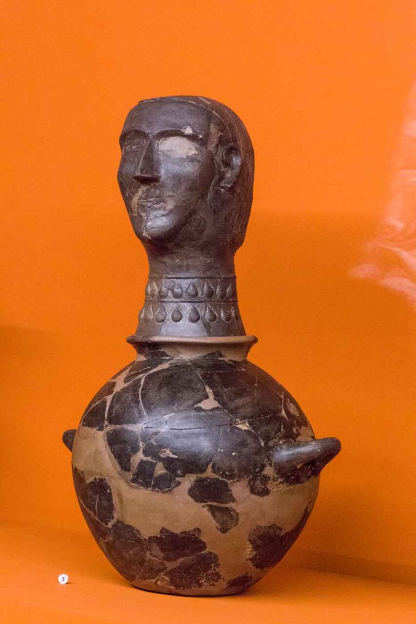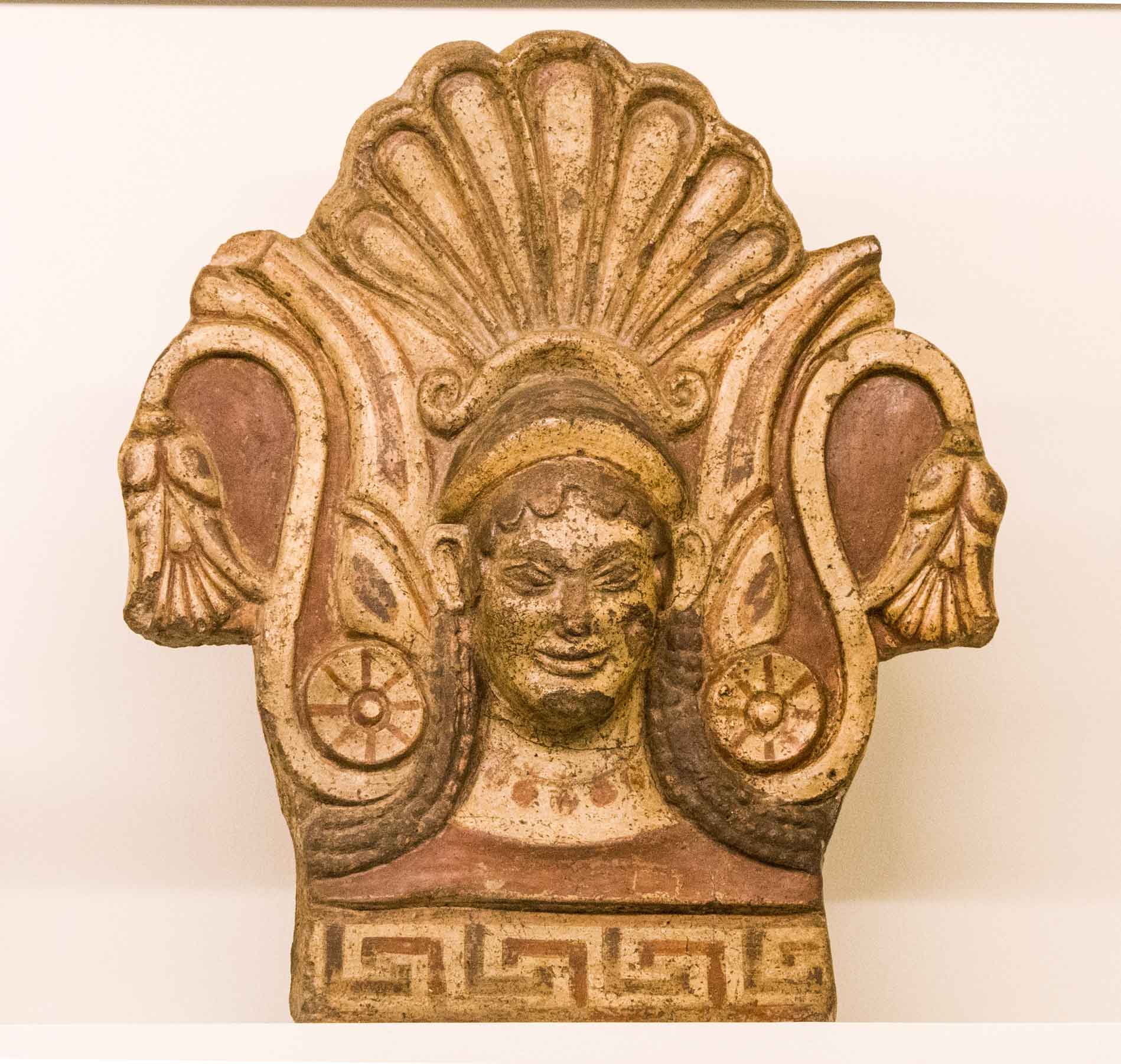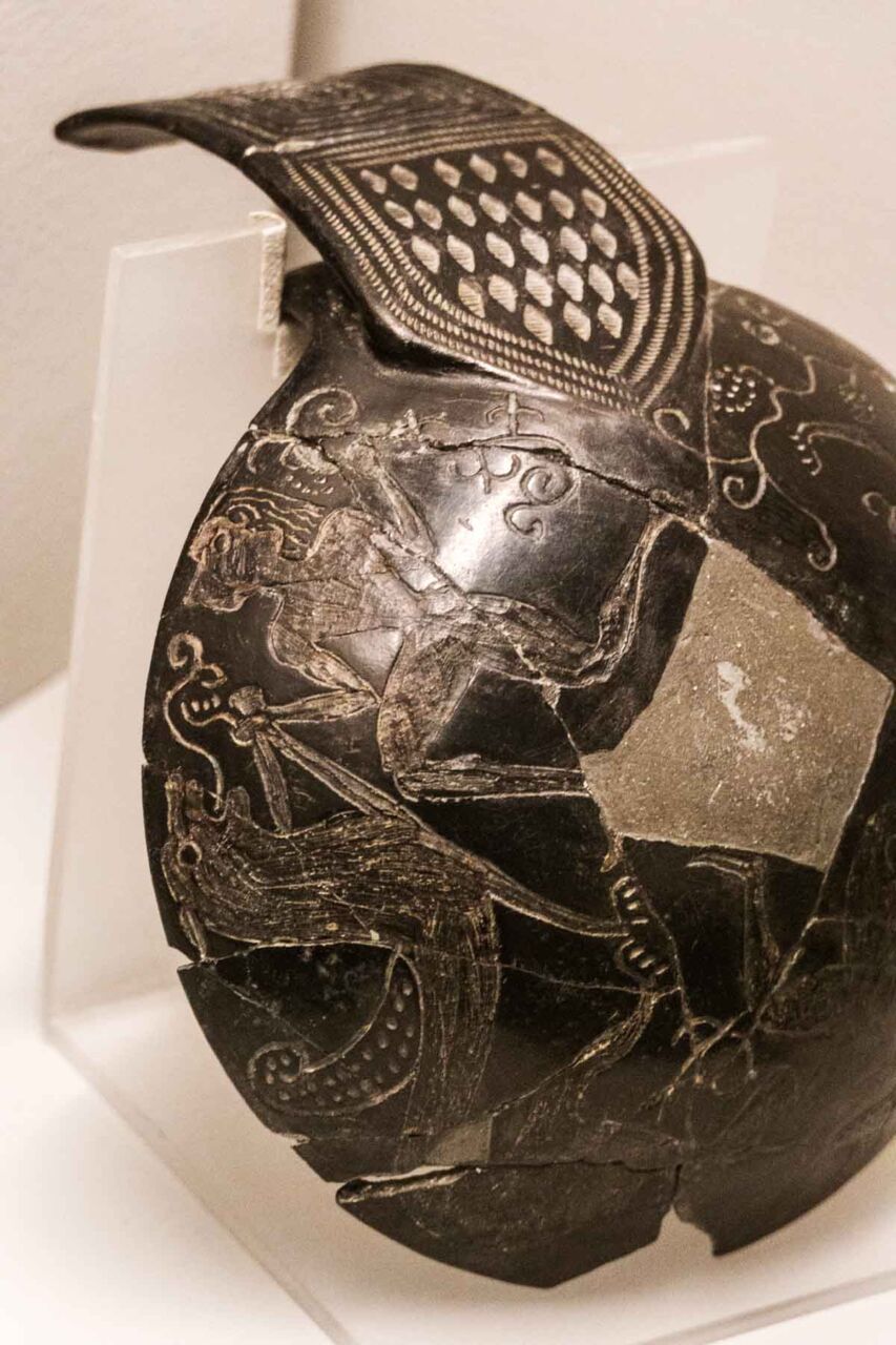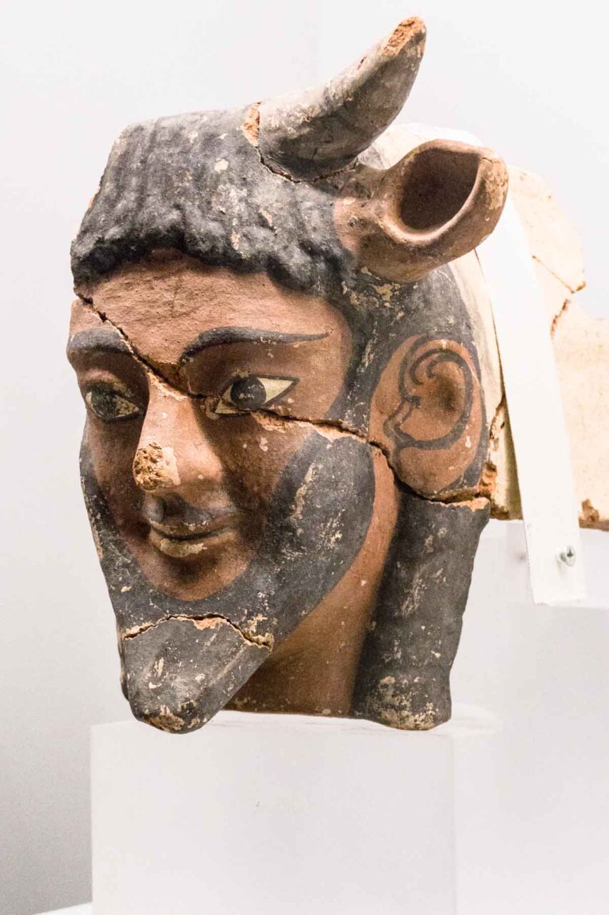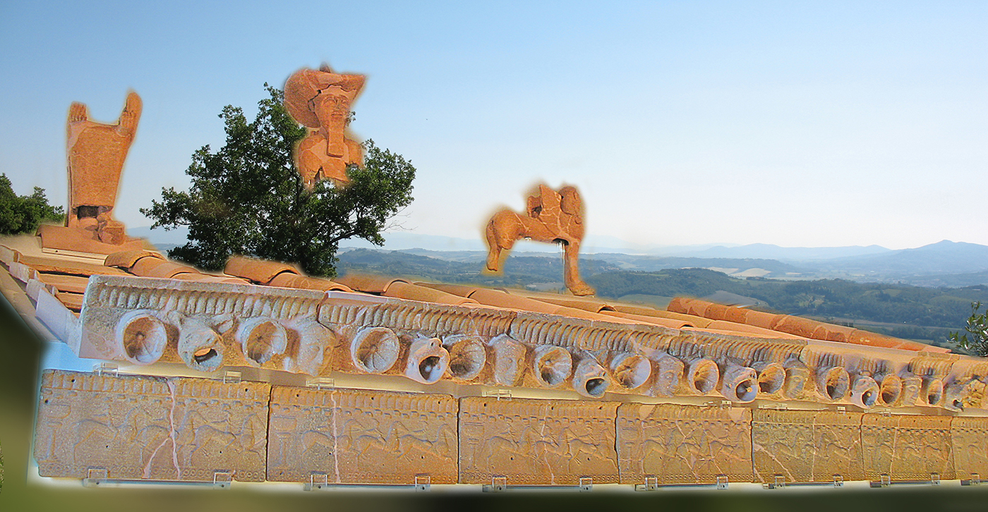 Il territorio di Chianciano, oltre alle terme, ha dato un contributo documentale archeologico interessantinssimo – ricordiamo la tomba affrescata della “Quadriga infernale”. In mostra, da una sepoltura del VII sec. a. C., in migliaia di pezzi, un urna, che dopo anni di paziente restauro ricostruttivo– un eccellenza tutta italiana -, è un unicum: corpo e coperchio ornati da grifoni e “uomini grifoni” che rimandano a modelli iconografici che ritroviamo in tempi molto antichi in Anatolia. Deliziose le urne cinerarie “a canopo”; grandiose in terracotta dipinta le decorazioni dei tetti non solo di templi ma anche per residenze di “principi” da Murlo.