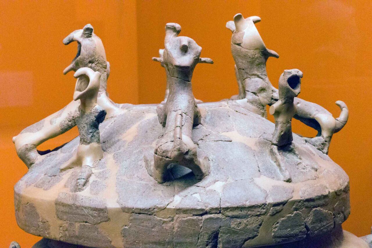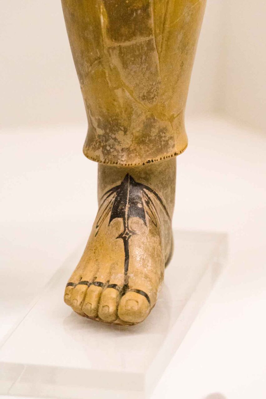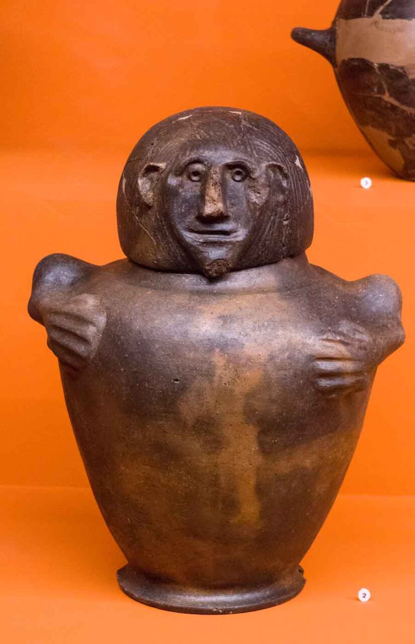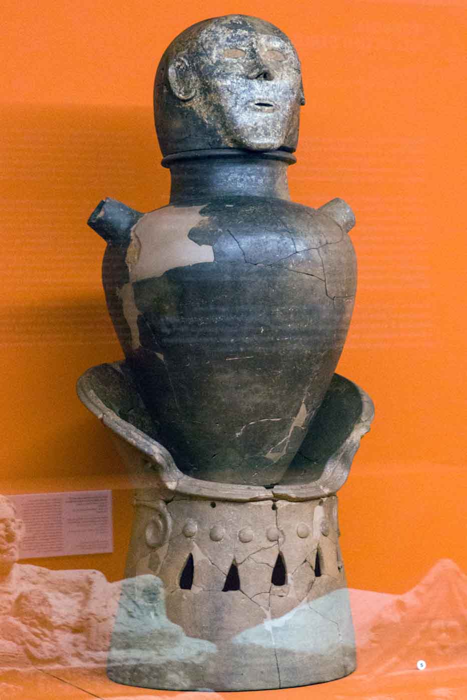 Il territorio di Chianciano, oltre alle terme, ha dato un contributo documentale archeologico interessantinssimo – ricordiamo la tomba affrescata della “Quadriga infernale”. In mostra, da una sepoltura del VII sec. a. C., in migliaia di pezzi, un urna, che dopo anni di paziente restauro ricostruttivo– un eccellenza tutta italiana -, è un unicum: corpo e coperchio ornati da grifoni e “uomini grifoni” che rimandano a modelli iconografici che ritroviamo in tempi molto antichi in Anatolia. Deliziose le urne cinerarie “a canopo”; grandiose in terracotta dipinta le decorazioni dei tetti non solo di templi ma anche per residenze di “principi” da Murlo.