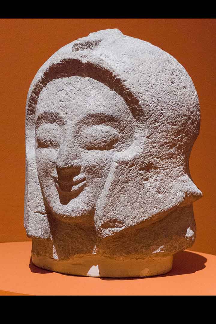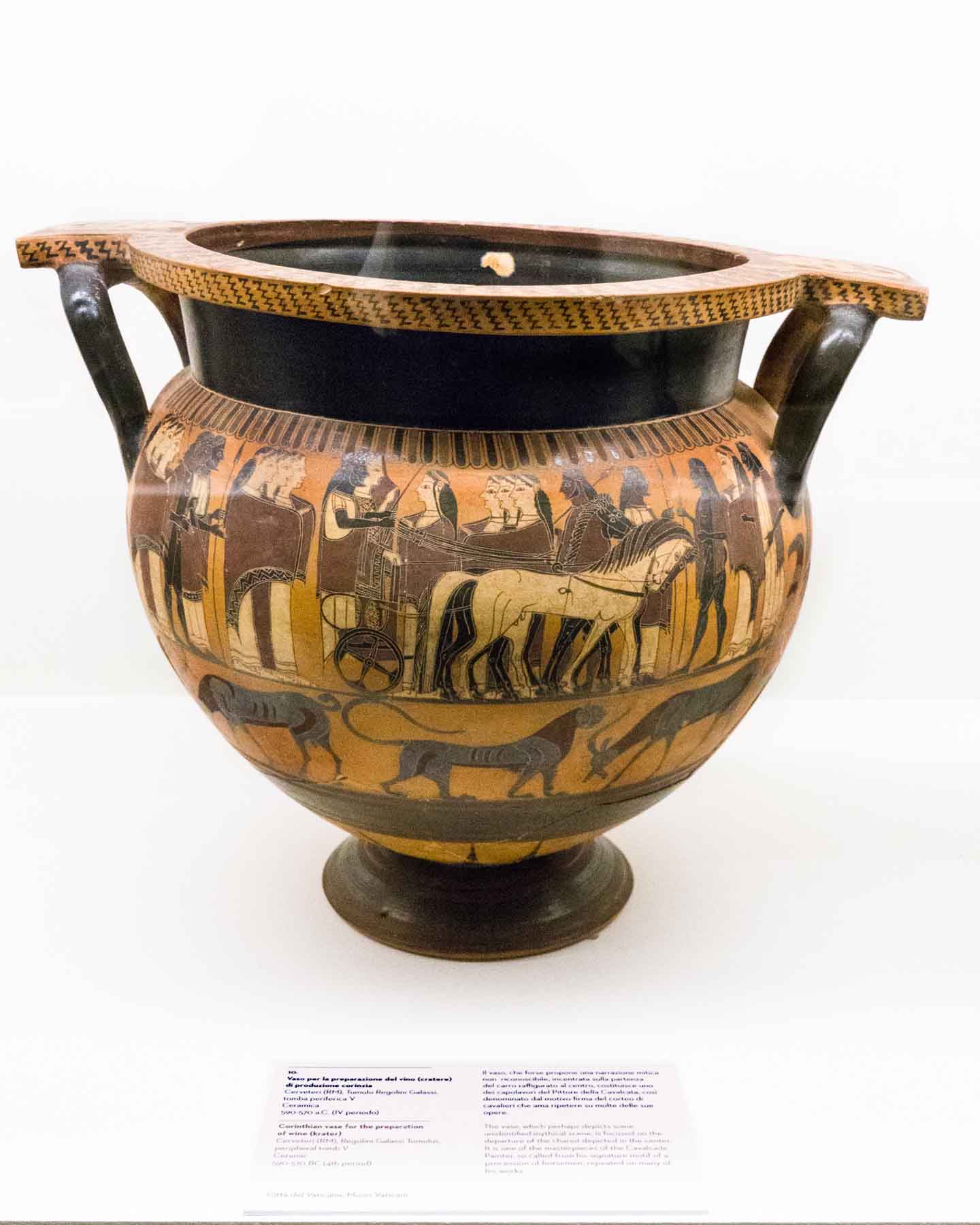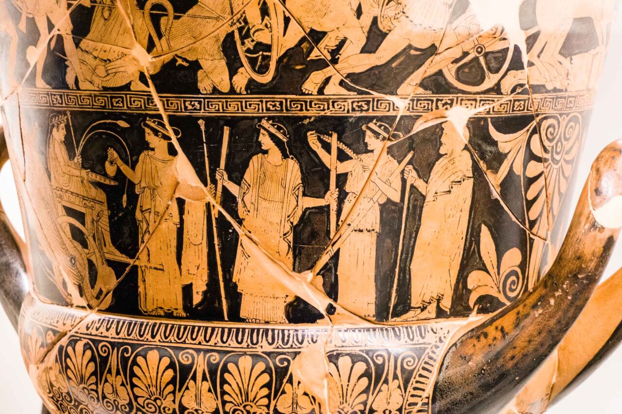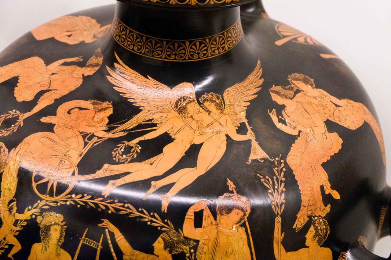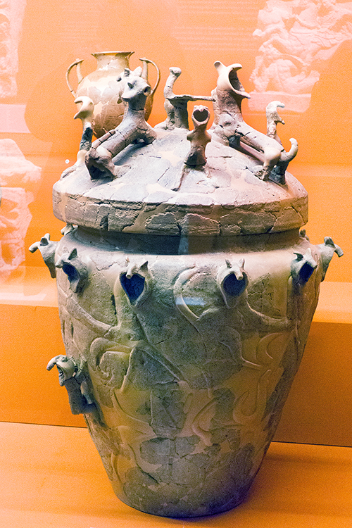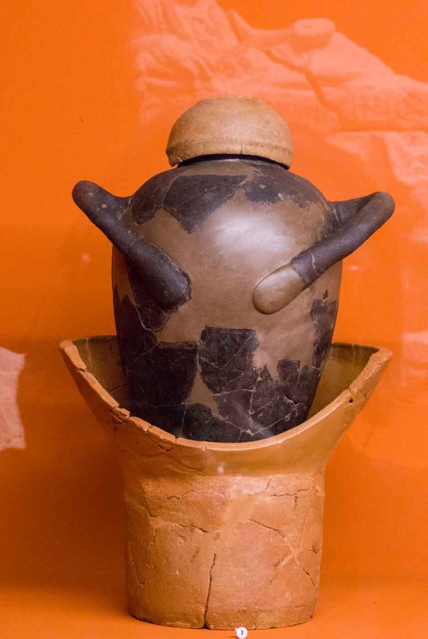 Il territorio di Chianciano, oltre alle terme, ha dato un contributo documentale archeologico interessantinssimo – ricordiamo la tomba affrescata della “Quadriga infernale”. In mostra, da una sepoltura del VII sec. a. C., in migliaia di pezzi, un urna, che dopo anni di paziente restauro ricostruttivo– un eccellenza tutta italiana -, è un unicum: corpo e coperchio ornati da grifoni e “uomini grifoni” che rimandano a modelli iconografici che ritroviamo in tempi molto antichi in Anatolia. Deliziose le urne cinerarie “a canopo”; grandiose in terracotta dipinta le decorazioni dei tetti non solo di templi ma anche per residenze di “principi” da Murlo.