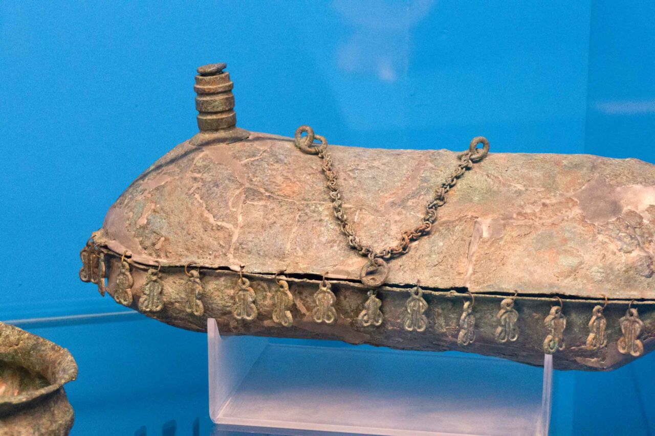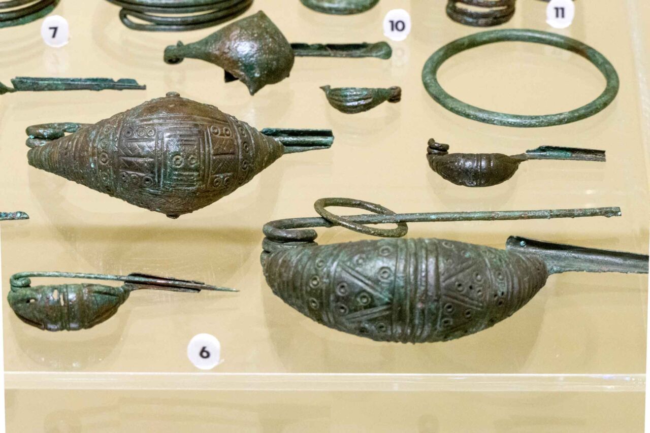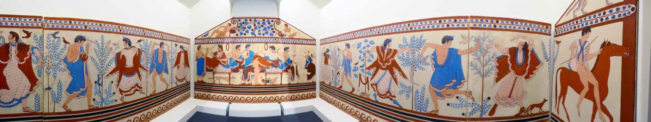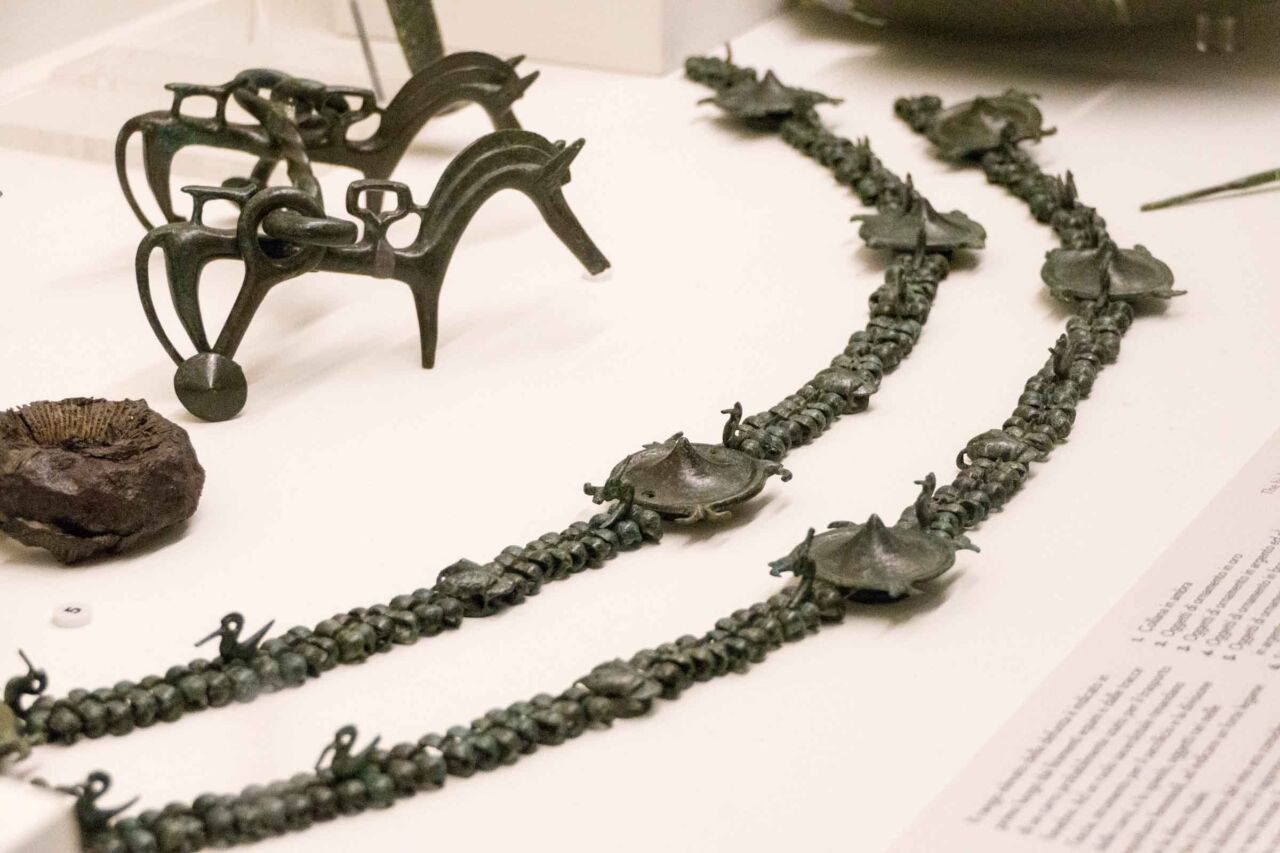 Accanto alla salma del defunto erano riposti oggetti ispirati per tipologia al quotidiano nella vita reale ma per la scelta dei materiali, delle forme e dell’ornato divenivano spesso vere opera d’arte. Ciò che doveva adornare il corpo o le urne cinerarie era fatto di stoffe frutto della perizia di abili tessitrici. La cura del corpo era assicurata da profumi, unguenti, sostanze medicinali contenute in balsamari di forme e materiali fantasiosi e provenienti anche da lontane terre. Gioielli ornavano la salma ed erano realizzati con metalli – lavorati con tecniche come sbalzo, incisione e granulazione -, con applicazioni di vetri, ambre e minerali rari. Il corredo per i militari, in genere appartenenti agli alti ranghi della comunità, comprendeva armi per difesa ed offesa, armature per il corpo e per la protezione dei cavalli, preziosi compagni nella vita e poi nel al di là. Anche questi ultimi, con ricche bardature, animavano le scene dipinte sulle pareti degli ipogei funerari, dove erano rappresentate vivaci scene di convivi, condivisi con ospiti ed allietati da musiche e danze.Accanto alla salma del defunto erano riposti oggetti ispirati per tipologia al quotidiano nella vita reale ma per la scelta dei materiali, delle forme e dell’ornato divenivano spesso vere opera d’arte. Ciò che doveva adornare il corpo o le urne cinerarie era fatto di stoffe frutto della perizia di abili tessitrici. La cura del corpo era assicurata da profumi, unguenti, sostanze medicinali contenute in balsamari di forme e materiali fantasiosi e provenienti anche da lontane terre. Gioielli ornavano la salma ed erano realizzati con metalli – lavorati con tecniche come sbalzo, incisione e granulazione -, con applicazioni di vetri, ambre e minerali rari. Il corredo per i militari, in genere appartenenti agli alti ranghi della comunità, comprendeva armi per difesa ed offesa, armature per il corpo e per la protezione dei cavalli, preziosi compagni nella vita e poi nel al di là. Anche questi ultimi, con ricche bardature, animavano le scene dipinte sulle pareti degli ipogei funerari, dove erano rappresentate vivaci scene di convivi, condivisi con ospiti ed allietati da musiche e danze.