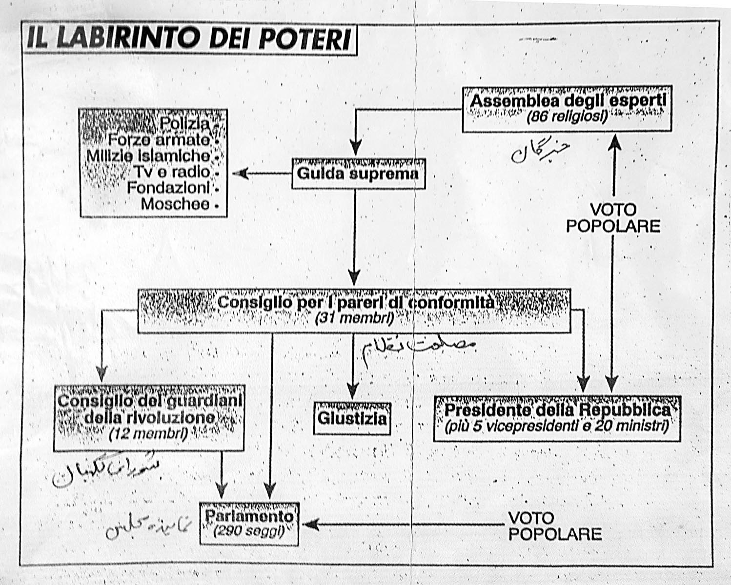La storia di una terra tormentata e gloriosa si legge in mille modi attraversando il paese, a contatto con la gente comune che, aspirando alla modernità, si trova a confrontarsi con l’integralismo religioso del governo che controlla ogni espressione del quotidiano. Immagini di Ayatollah presenziano ad ogni attività, in ogni luogo; il ruolo della donna serrato sotto un burka. Il “Labirinto politico-religioso” schematizzato sotto può dare solo una pallida idea della complessità della situazione del paese. Attraversandolo infinite sono le sfaccettatura di questa regione incastonata tra mare e montagne, percorsa da fiumi che sono stati confini politici contesi, come le risorse naturali che il territorio ha sempre offerto.