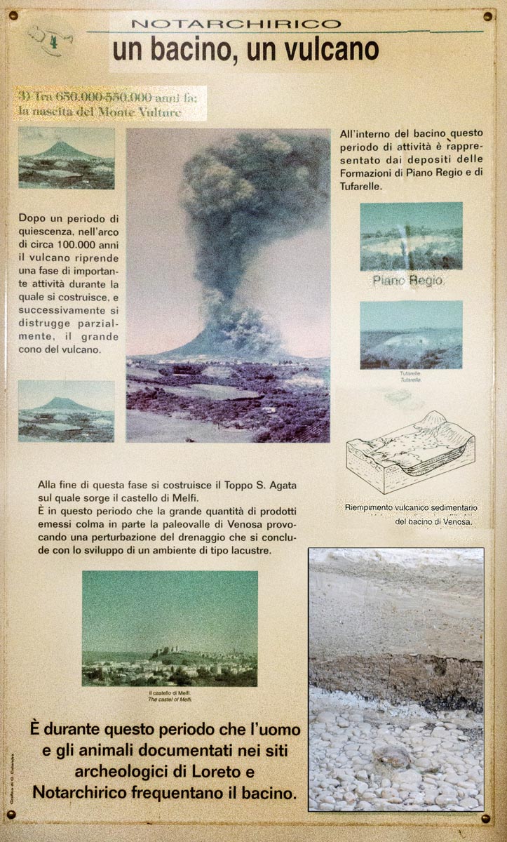 E’ un unicum in Italia ed uno degli esempi di scavo paleostratigrafico a gradini di un ‘area che, rimasta intonsa da lavori agricoli, si offre al visitatore come una “scalinata nella storia” che dalla superficie del piano di campagna attraversa gli eventi di passate ere: una macchina dei tempi geologico-tettonico-climatici del Vulture! Emergono resti fossilizzati di molte specie di animali e pollini di piante ora estinti, ancora oggi una fonte di studio e scoperte. A Notarchirico, lave e ceneri si alternano a strati di origine marina e pelagica. Qua,”fotografata”, grazie ad una combinazioni di eventi climatico-geologico, la scena di una fortunata caccia all’elefante di un gruppo di cacciatori del Paleolitico inferiore (300/400.000 anni fa) che ne hanno abbandonato le ossa smembrate, scarnificate e segnate dai loro utensili di pietra. Gli stessi strati ci hanno restituito anche un femore di una femmina di ominide di ca. 300.000 anni fa, ora conservato nel Museo archeologico, nella nuova sezione paleoantropologica, di Venosa.