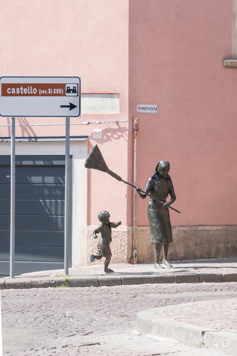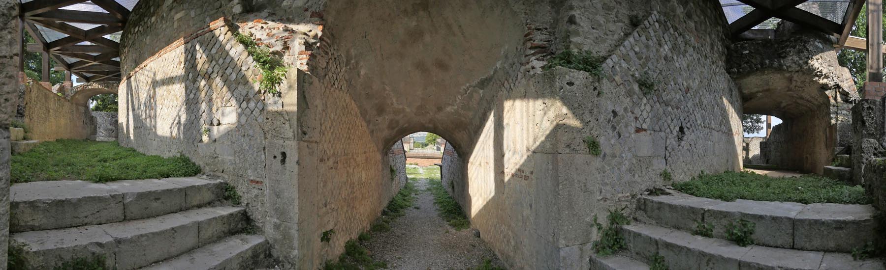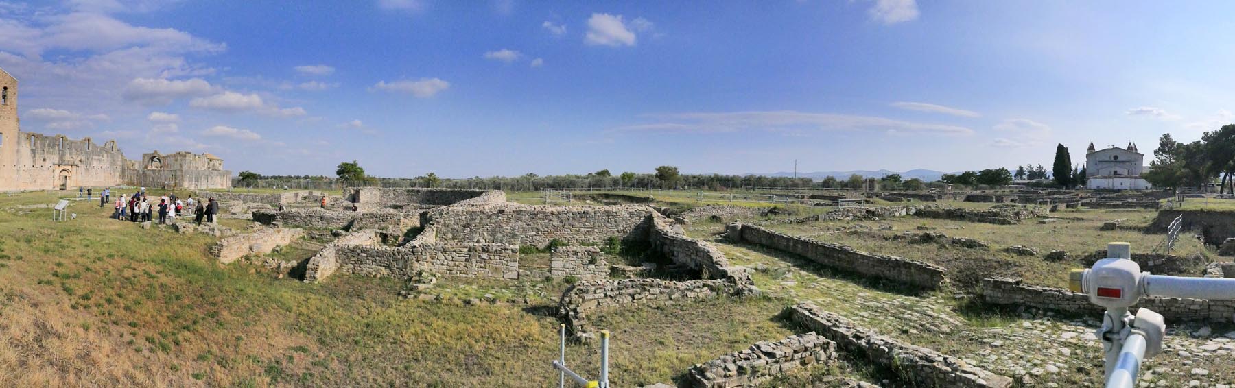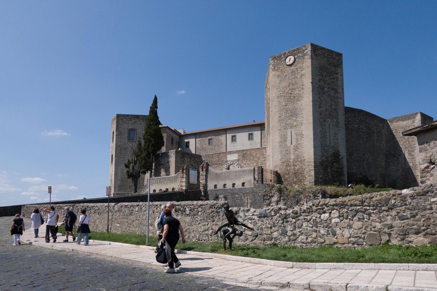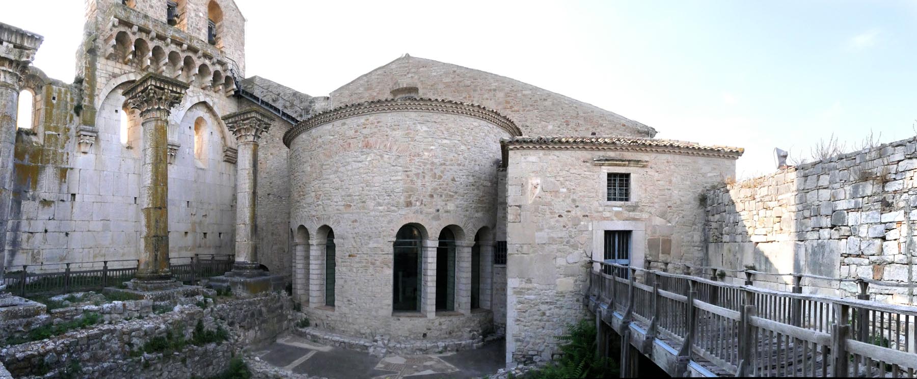Costruzioni si sovrapposero ad altre, spesso riutilizzando marmi, statue, lapidi, elementi architettonici di edifici preesistenti soprattutto del periodo romano, che incastonano i muri dei chiese ed edifici pubblici e privati della cittadina contemporanea: girando per le vie e scalinate fa gioco scoprire ed indovinare cosa e a quale scopo una decorazione era stata originariamente realizzata!….furono anche usati per l’edificazione, presso l’attuale area archeologica romana, solo in parte esplorata, di una complesso monastico benedettino che però, per le alterne vicende della storia, non trovò completamento; così l’aggirarsi tra pareti, colonne, absidi solo abbozzate, archi ed architravi che non reggono peso se non del cielo, evoca surreali suggestioni!