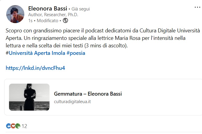 Grazie anche alle mie sorelle, Alessia Marabini , Tullia Marabini , e alla nostra zia Bianca Marabini , per l’energia con cui stanno sostenendo questi ultimi sforzi di babbo. È un impegno condiviso che nasce dal desiderio di lanciare un segnale di fiducia e di incoraggiamento rivolto alla nostra comunità.